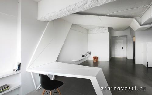 Творческое использование криволинейных форм крыши и стен, повторяющих контуры реки, сочетается с такими же линиями в интерьере.