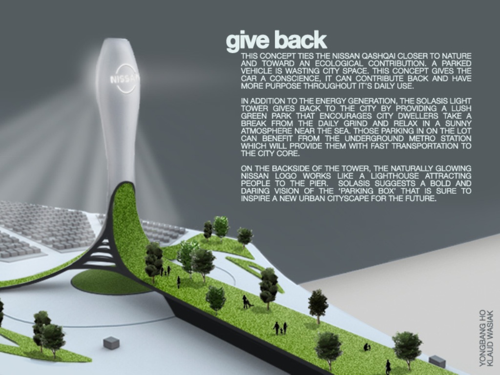 Компания Ниссан (Nissan) выступила инициатором создания перспективных проектов городских паркингов, пригласив дизайнеров из разных стран мира заглянуть в будущее. Одним из требований конкурса было включение в дизайн-проект какого-либо элемента городского кроссовера Ниссан (Nissan Qashqai) или всей модели целиком.