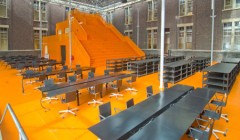 “Фабрика” представляет собой трехэтажную оранжевую структуру, совмещающую лекторный зал, переговорные комнаты и лабораторные помещения.