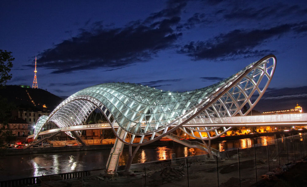 Мост на реке Мткрави, проект итальянского архитектора Мишеля Де Люччи (Michel De Lucchi) и французского осветителя Филиппа Мартино (Philippe Martinaud), Тбилиси, Грузия.