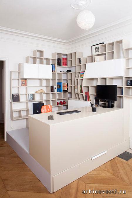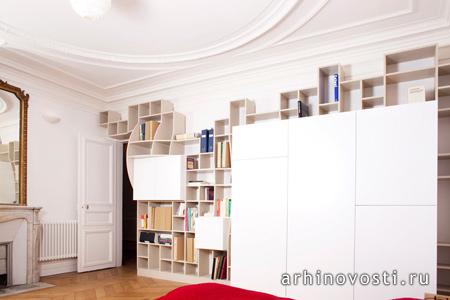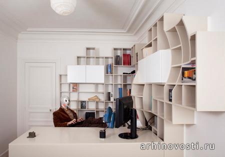 Поля Кудами (Paul Coudamy) клиент попросил создать такой интерьер, где он будет наслаждаться своими книгами и фильмами. В итоге вся квартира клиента, начиная от спальни и заканчивая персональным кабинетом, обогнута гибкими полками.