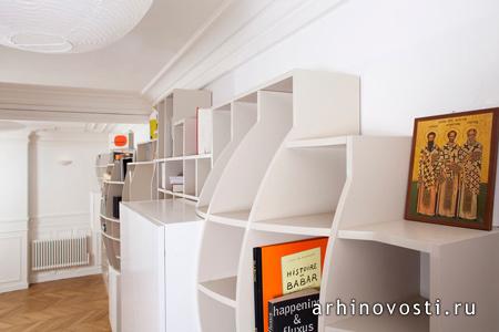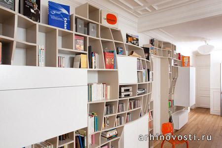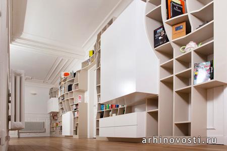 Гибкая полка для книг обогнула квартиру. Париж, Франция.