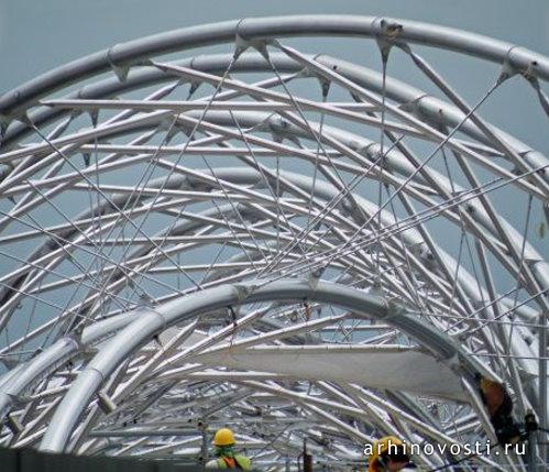 Разработкой моста занимались дизайнеры австралийской фирмы Кокс группа (Cox Group), инженеры из фирмы Аруп (Arup) и сингапурская компания Architects 61. Мост сделан из больших и малых стальных спиралей, они словно обвивают друг друга. Если стальные жгуты вытянуть, то их длина составит 2250 метров, вся структура весит 1700 тонн, что эквивалентно 1130 автомобилям. Специальное освещение (надеюсь LED!) может быть использовано для создания специального настроения.