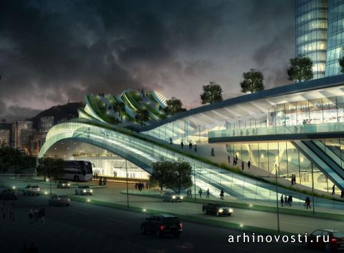 В комплексе будет 400 000 кв.м. коммерческих площадей, их разместят над станцией. Высота проекта – 45 метров, здание повышается постепенно, ступенчато, открывая вид на небо Гонконга и Парк Виктории, расположенный за станцией. Здание станции становится как бы амфитеатром, где представление – сам город, открывающийся на противоположном берегу реки. Арена здесь – множество пешеходных дорожек, превращенных в цветущий сад.