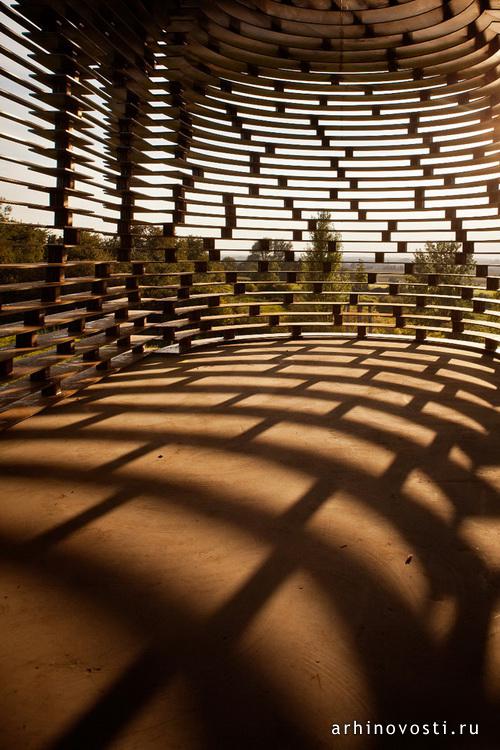 Изнутри строения через сотни прямоугольных отверстий перед посетителем открывается вид на сельскую местность.