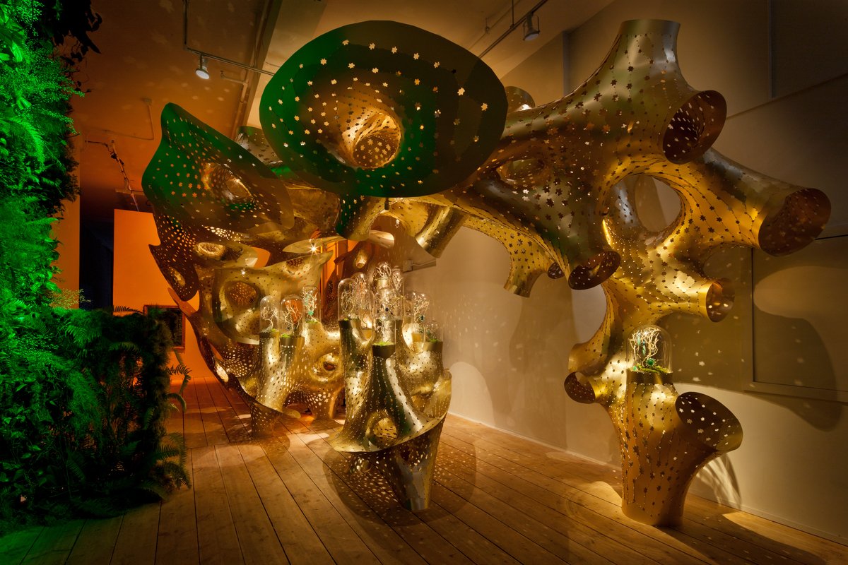 С помощью компьютерных технологий Марк Форнс разработал золотистое извивающееся пространство, в центре которого сконцентрированы стеклянные колбы.