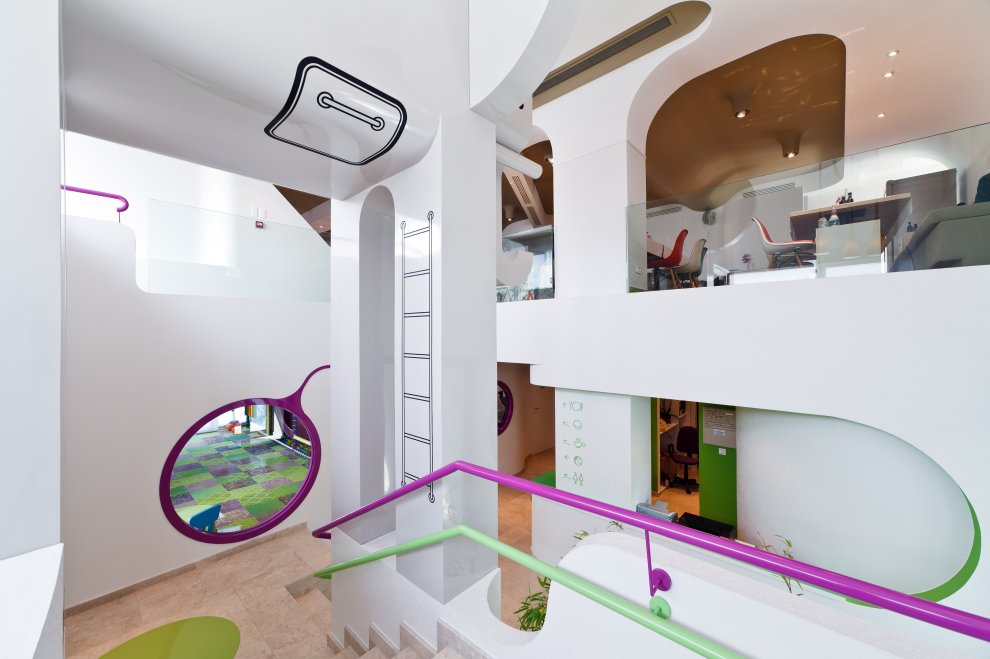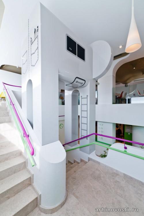 Многочисленные круглые проёмы между помещениями образуют неплохой обзор и дают возможность родителям присматривать за своими чадами.