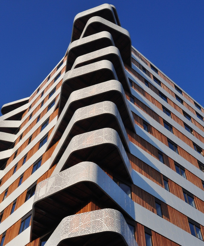 Мне нравится свободная форма балконов в этом проекте. Немного вызывает сомнения применение обшивки деревом, потому что долговечность дерева значительно меньше чем у металла. Как правило, здания строят из материалов с одинаковой долговечностью.