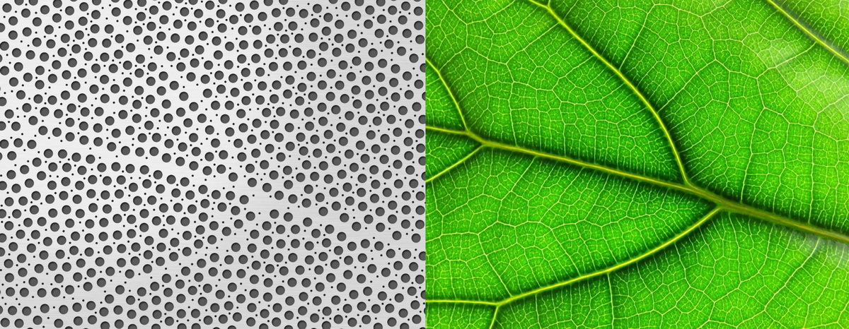 В железных пластинах, ограждающих каждый выступ, проделаны сотни декоративных дырочек. Они расположены так, что получившийся в результате рисунок напоминает строение зелёного листа.