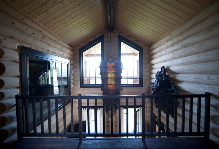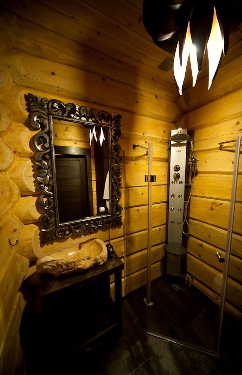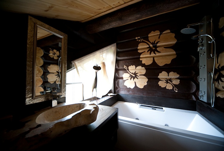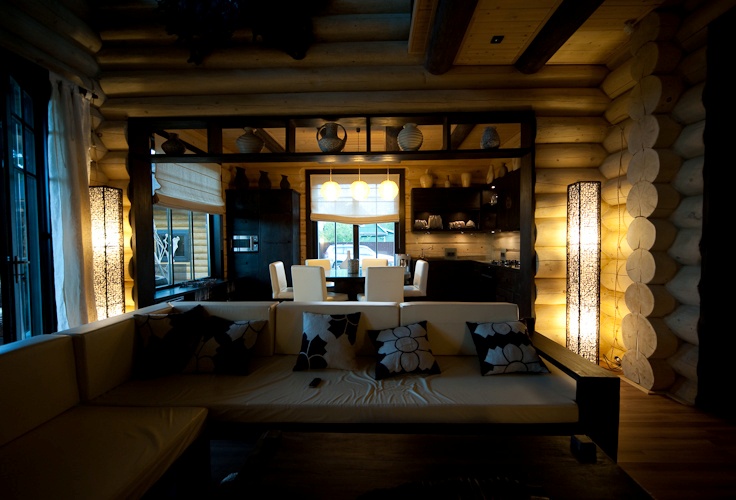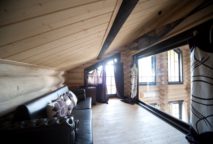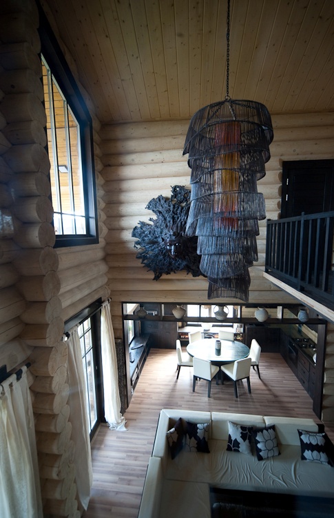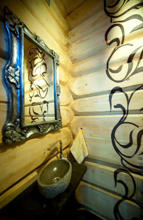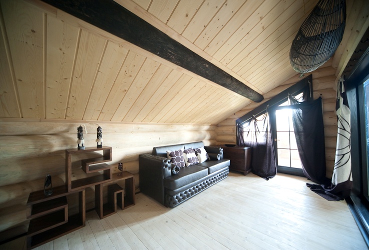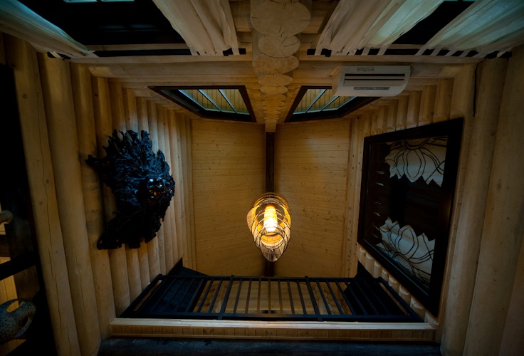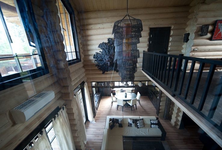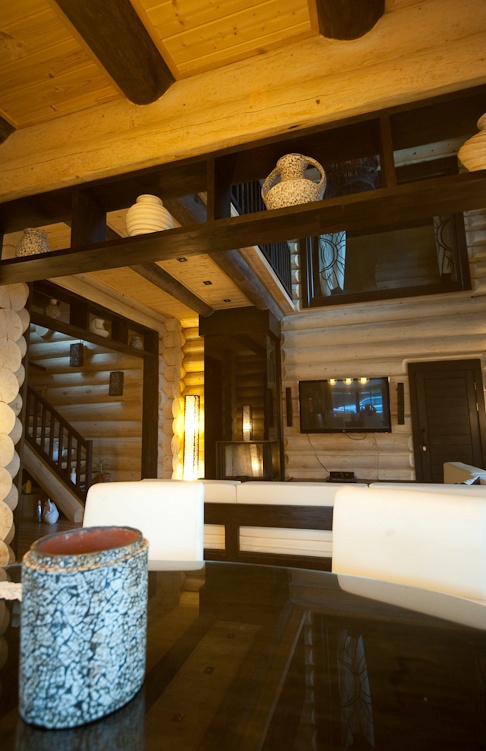 Концепция дизайна внутренних помещений сочетает в себе классическую для бревенчатого строения отделку стен с элементами этнического минимализма. Вся мебель и предметы интерьера ( перила, ступени, двери, наличники) выполнены точно по чертежам на заказ из массива тика умельцами на о. Бали.