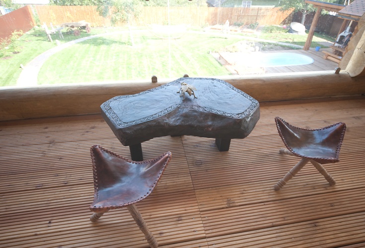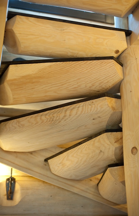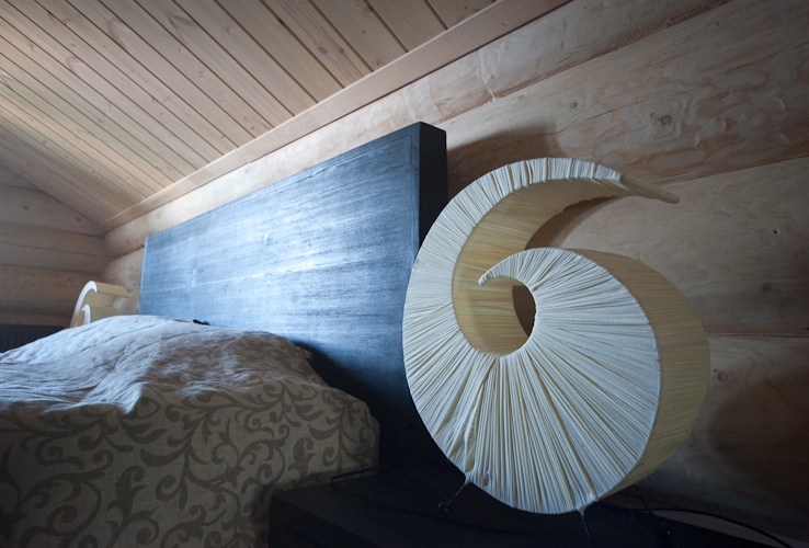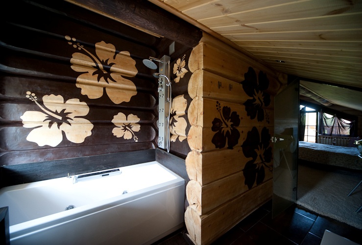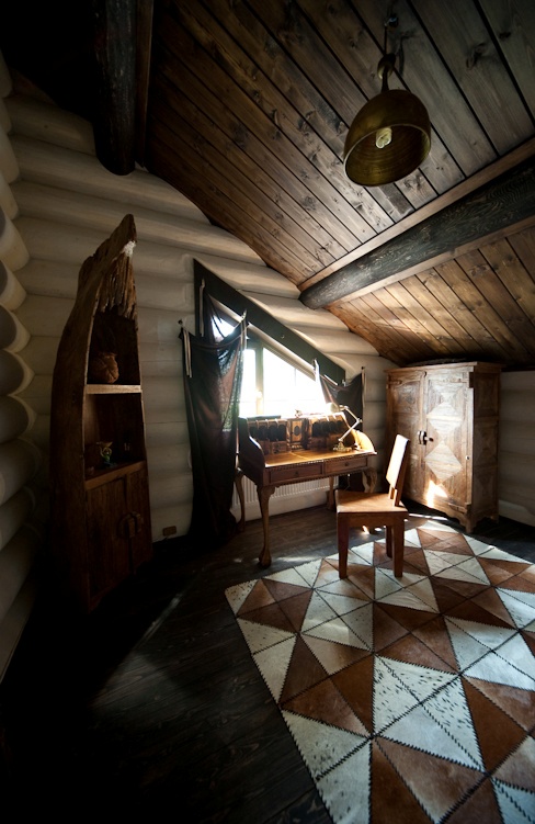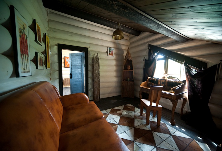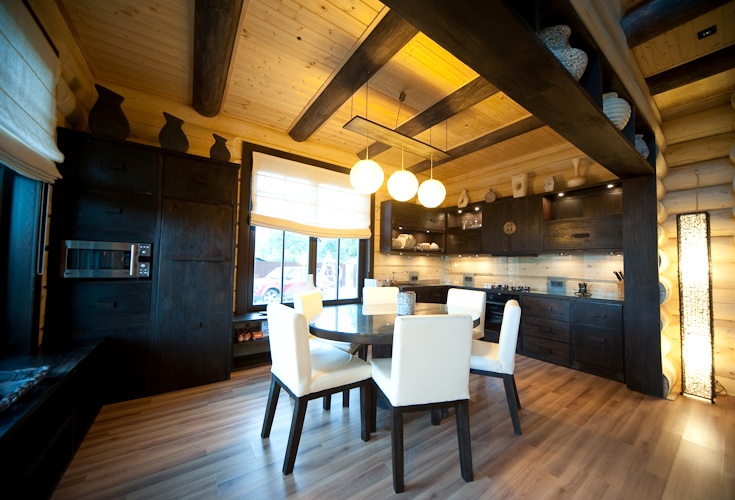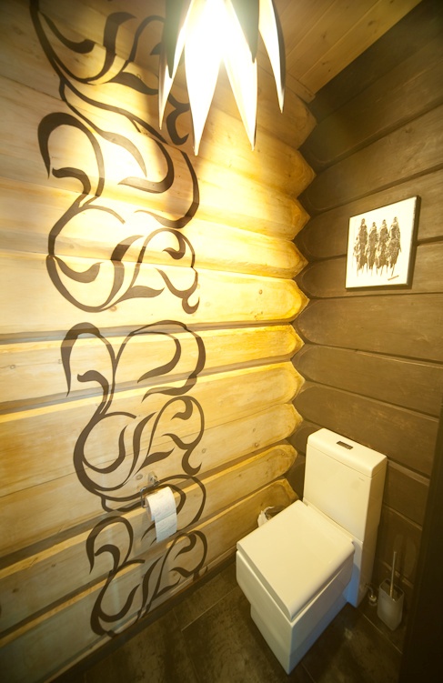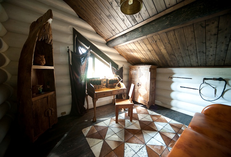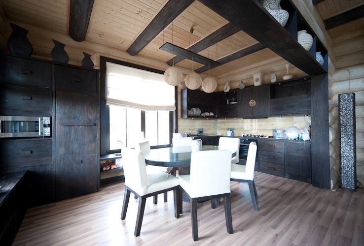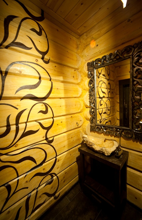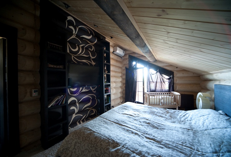 Концепция дизайна внутренних помещений сочетает в себе классическую для бревенчатого строения отделку стен с элементами этнического минимализма. Вся мебель и предметы интерьера ( перила, ступени, двери, наличники) выполнены точно по чертежам на заказ из массива тика умельцами на о. Бали.