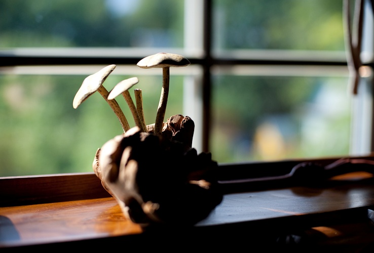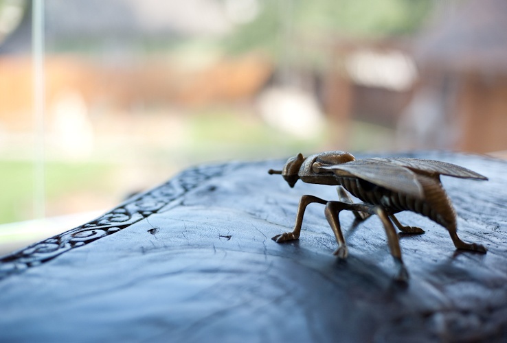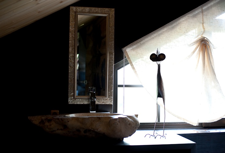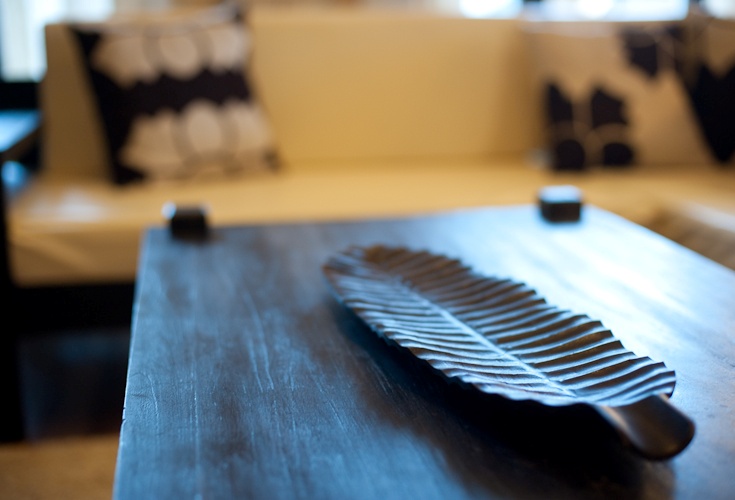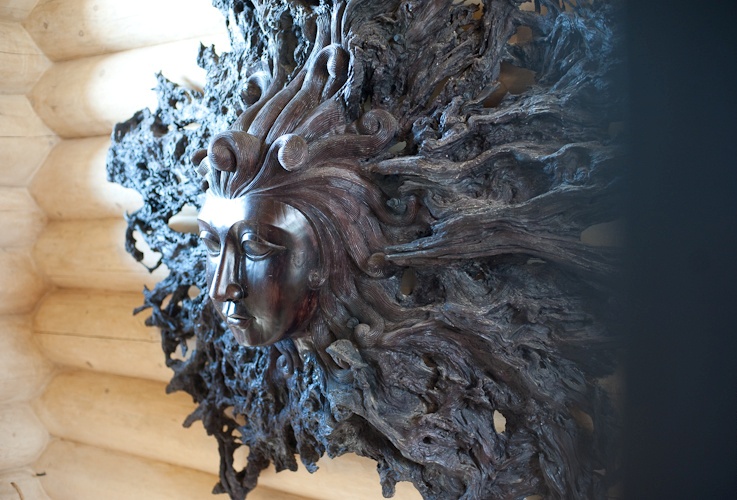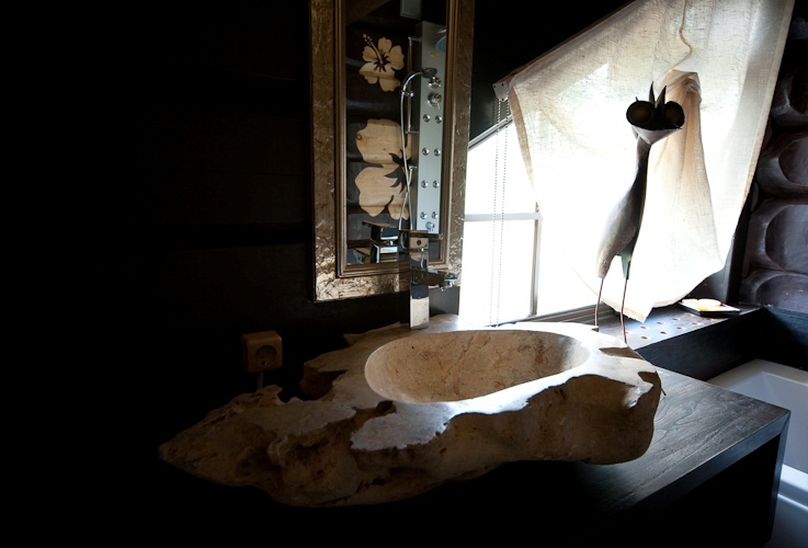 Текстиль – грубый лен с этнически вышивками и аппликациями. Так же в интерьере присутствует восстановленная антикварная индонезийская мебель – шкаф, сделанный из рыбацкой лодки, письменный стол и еще один шкаф. Фурнитура, некоторая часть светильников и предметов интерьера так же антикварные. Очень интересная деталь интерьера – лицо, выточенное из корня огромного дерева.