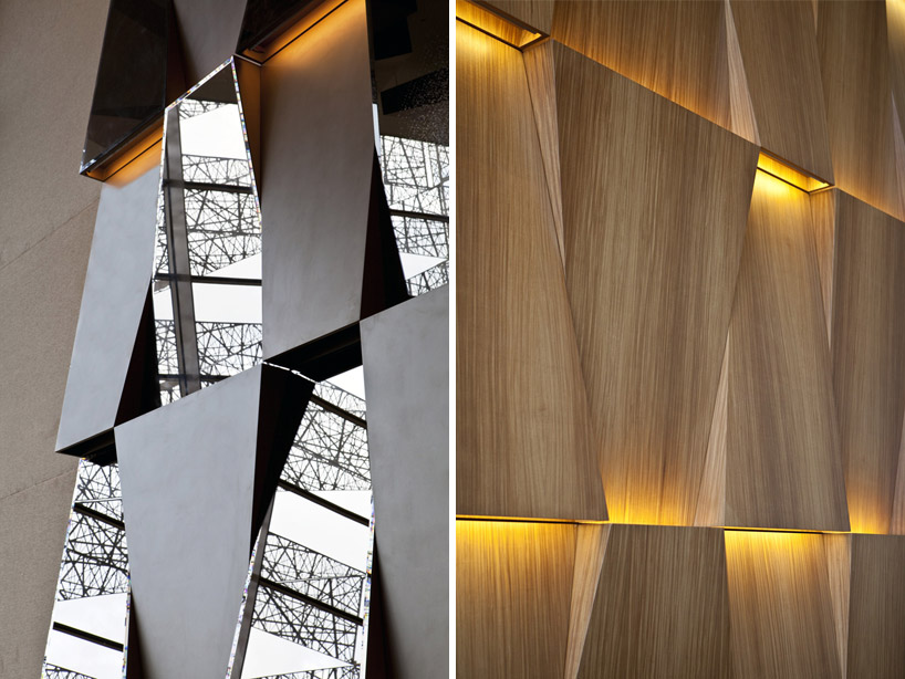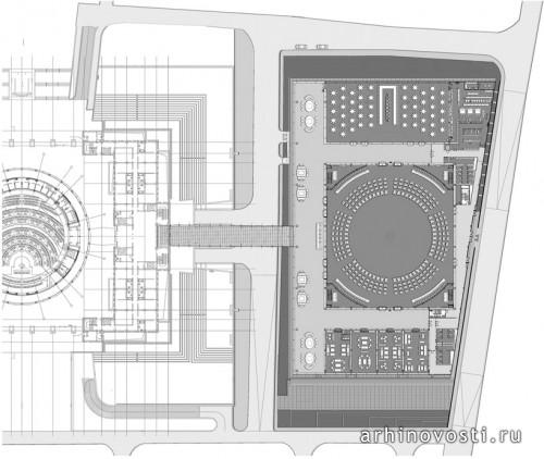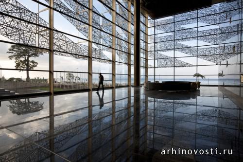 В двухэтажное здание можно попасть, пройдя по прозрачному пешеходному мосту, ведущему из старого здания в новый конгресс-центр.