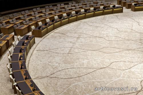 Зал заседаний имеет форму круга. Он спроектирован и отделан так, чтобы обеспечить действительно хорошую акустику.