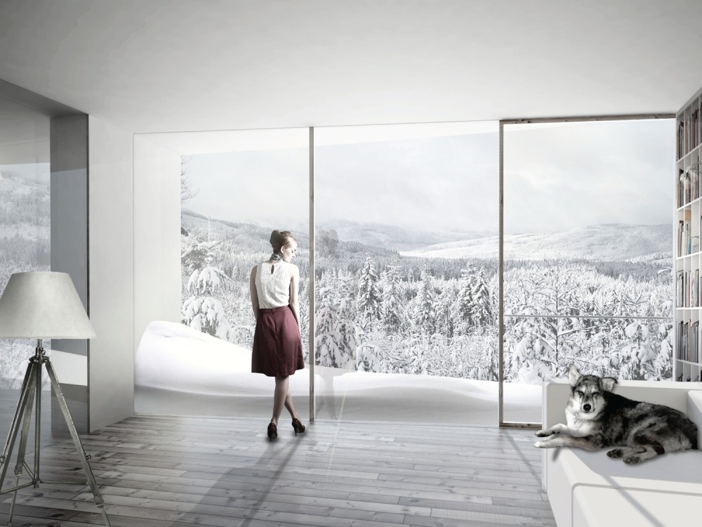 А серебристый снег, который скапливается перед окнами, становится настоящим элементом архитектуры.