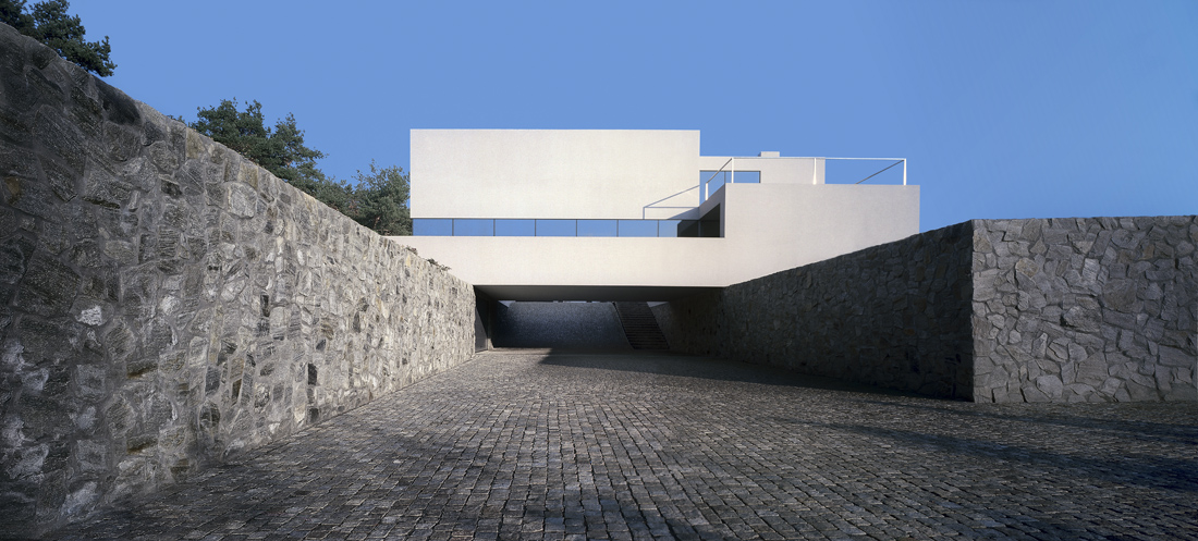 Дорога организована не по центру через сад, а сбоку строения. Кроме того дорога опускается ниже уровня земли и проходит под зданием во внутренний дворик.