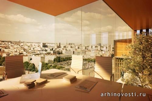 Наличие горизонтальной части позволило архитекторам спроектировать масштабные внутренние пространства с высокими потолками. Они будут отданы под приёмные помещения, основное фойе и кафетерий.