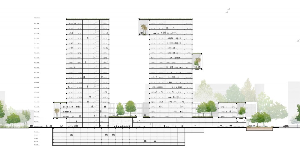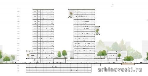 В рамках проекта велась активная работа как в вертикальной, так и в горизонтальной плоскостях. Две башни тесно связаны между собой с помощью горизонтальной базы.