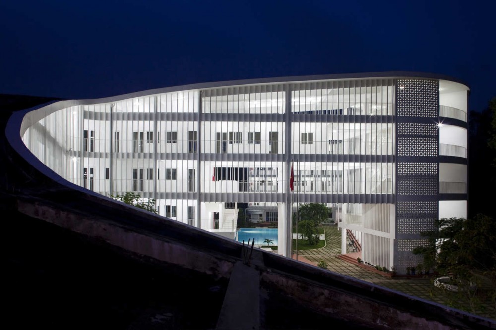 В новом вьетнамском городе Биньзыонг, который находится в 30 минутах езды от Хошимина, круглый год теплая погода, соответствующая тропическому климату. Город расположился среди цветущих фруктовых деревьев. В таком вот чудесном месте архитекторами Vo Trong Nghia, Daisuke Sanuki и Shunri Nishizawa была спроектирована школа на 800 учеников.