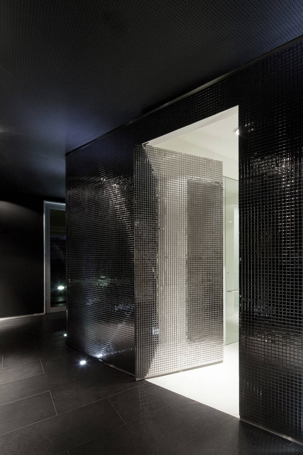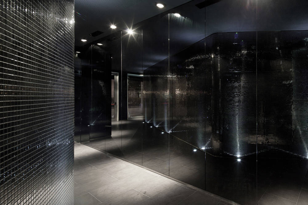 Важным элементом зоны стала скруглённая стена, покрытая чёрной зеркальной мозаикой. Основным цветом общественного помещения стал черный.