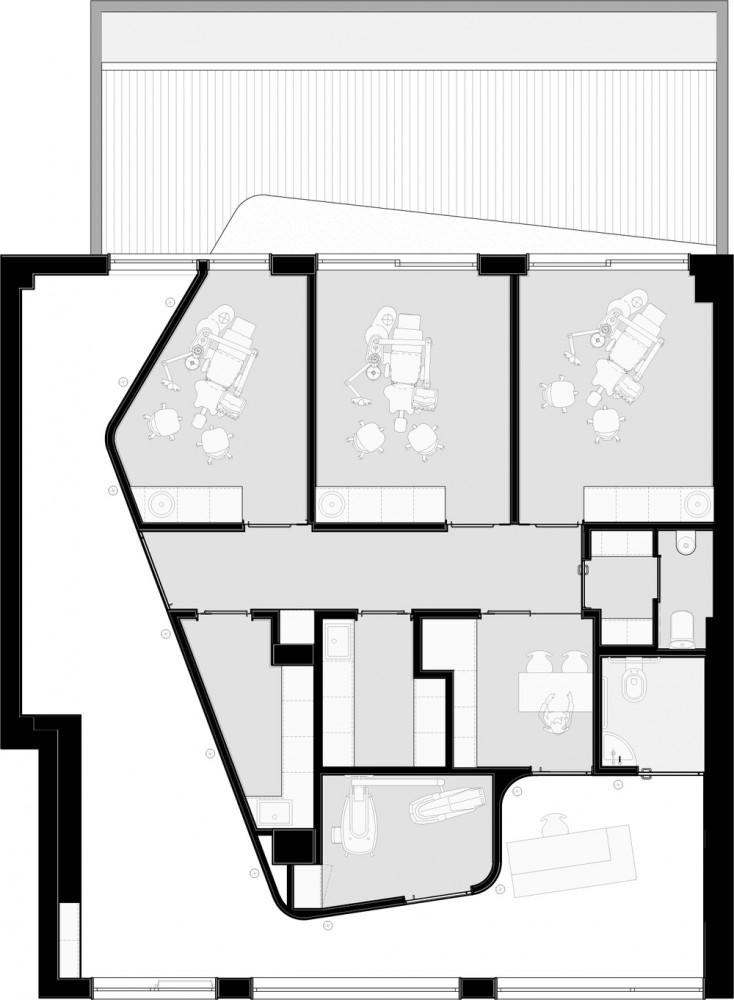 Дизайнеры из студии Pedra Silva Architects создали не совсем обычный интерьер для стоматологической клиники в Лиссабоне, Португалия. В основу своего проекта специалисты положили убеждение, что пространство подобных учреждений можно разделить на две зоны: зону, в которой проходит непосредственное лечение, и общественную зону.
