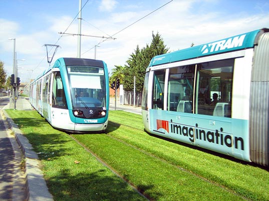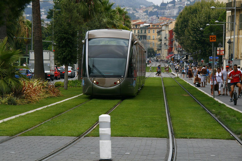 Выше: Зелёные трамвайные пути в Ницце, Франция.