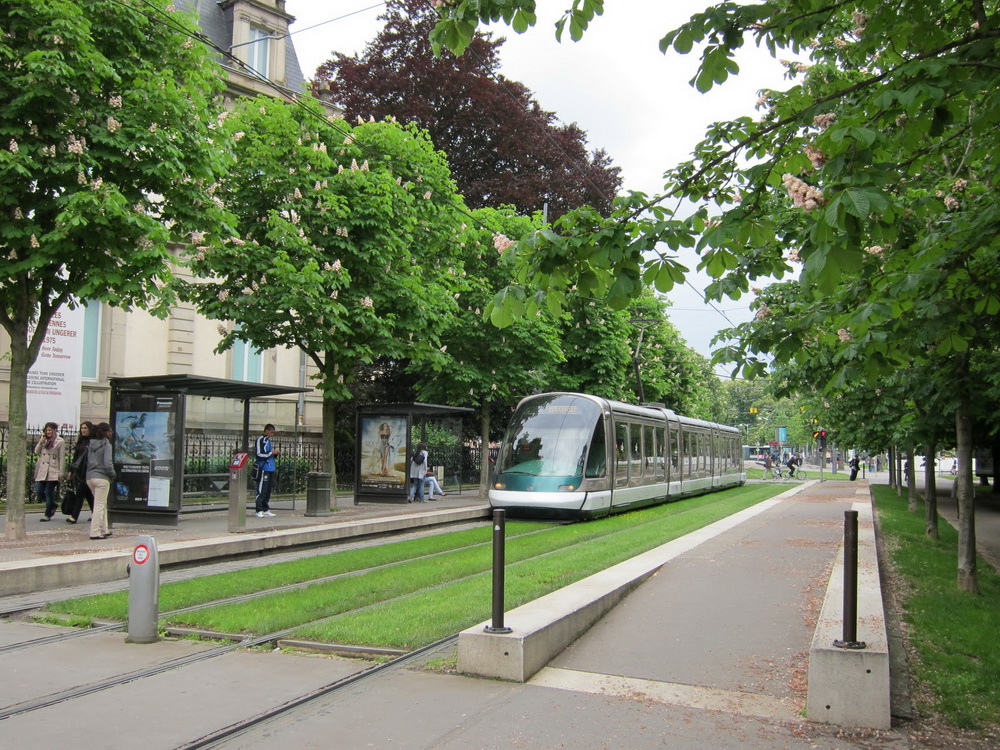 Выше: Зелёные трамвайные пути в Страсбурге, Франция.