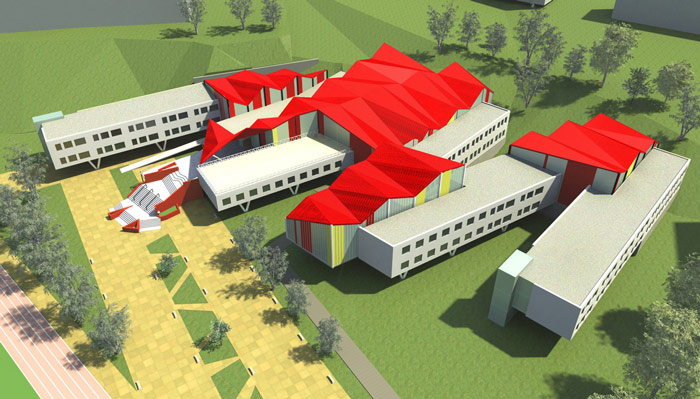 Второй этаж нависает над первым и поднят на колоннах, образуя тем самым зоны для отдыха на свежем воздухе, защищенные от непогоды. На первом этаже находятся 2 спортзала и школьная столовая, на втором и третьем этажах – учебные кабинеты. Таким образом, уникальное расположение блоков позволяет решить функциональные и инсоляционные вопросы в строительстве школьных зданий.