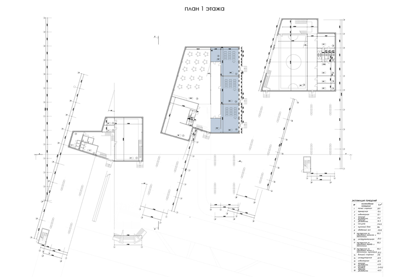 Школа состоит из 6 блоков, которые связаны между собой двухсветными рекреационными пространствами.