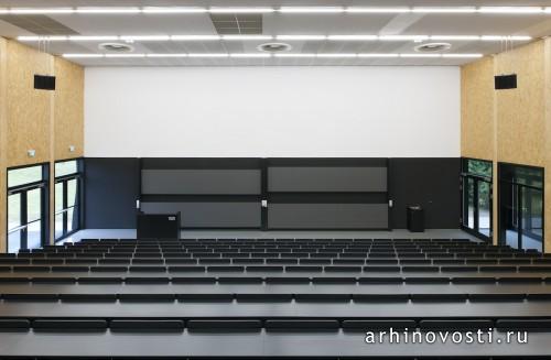 В здании разместились два лекционных зала на 479 и 288 человек. Они разделены между собой коридором.