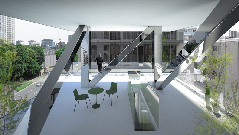 Из этой нестыковки и возникла идея разнести нижние этажи на значительное расстояние друг от друга, создав таким образом просторные открытые зоны, которых так не хватает в плотной городской застройке.