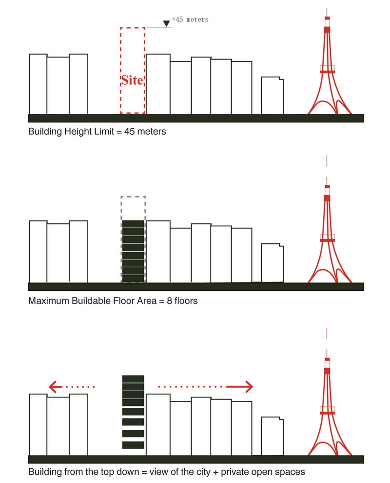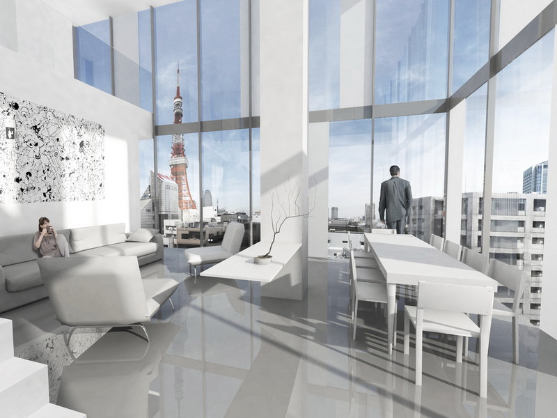 Под новый дом была отведен участок площадью всего лишь 130 квадратных метров. Зато в пешеходной доступности от площадки находится парк Сиба со знаменитой Телевизионной башней Токио.