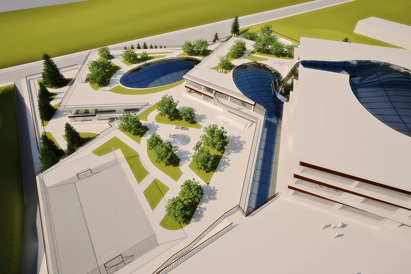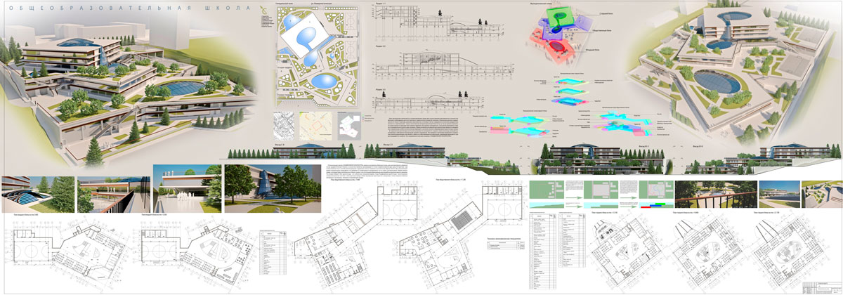 В условиях плотной городской застройки и сложного рельефа был выбран именно этот образ школы по причине наиболее выгодного решения пространства генерального плана участка. Были использованы актуальные в наше время приемы Лэнд морфинга в сочетании с бионикой и строгими формами конструктивизма. Часть учебного комплекса находится под землей, при этом использован каждый квадратный метр территории участка. Для смягчения строгости и лаконичности форм зданий и террас были использованы приемы бионики, которые очень органично вписались в общий вид генерального плана.