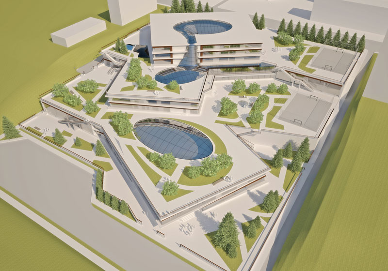 Здание школы развивается горизонтально, равномерно распределяясь по рельефу и внутри него.