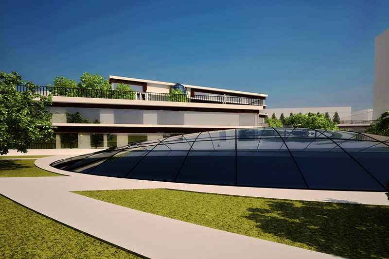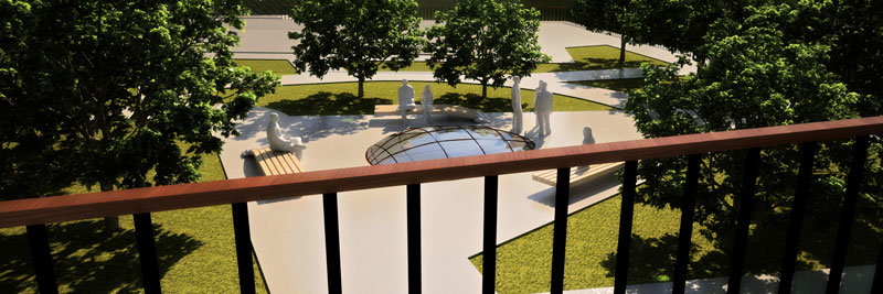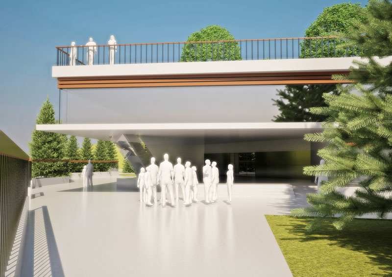 Было принято решение сформировать ступенчатую структуру генерального плана участка и разбить при помощи террасирования участок на три ступени. Террасы являются единым пространством и связаны между собой вертикальными коммуникациями (лестницы и внешние лифты). Так же две из трех террас оснащены спортивными площадками. Все террасы озеленены. На второй террасе располагается хозяйственная зона, на первой располагается временная парковка.
