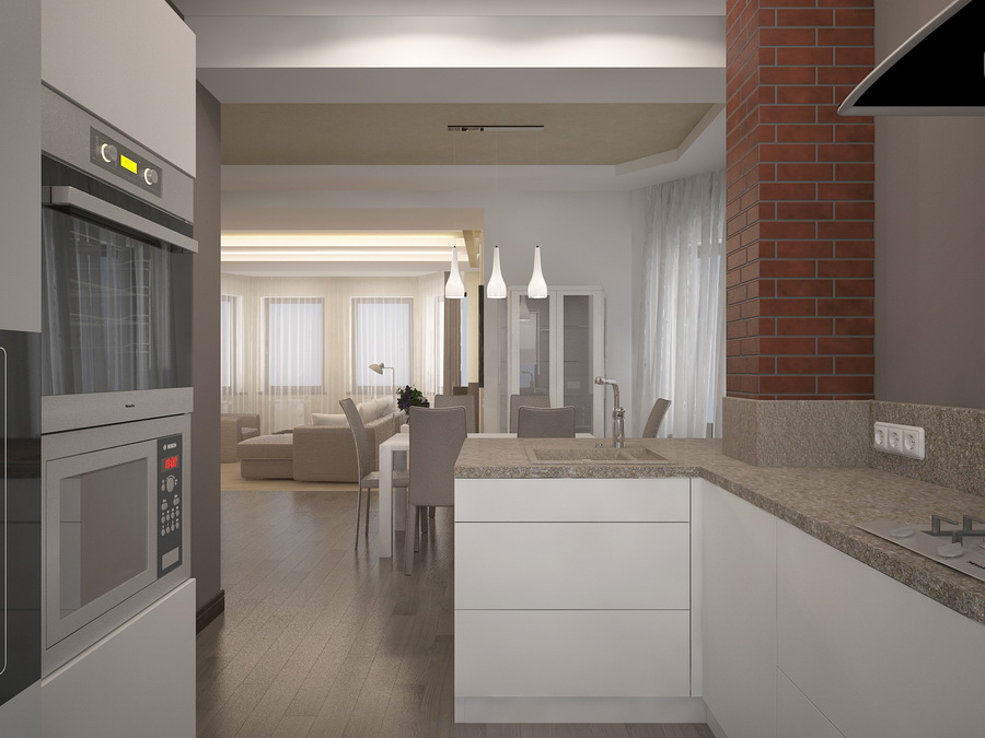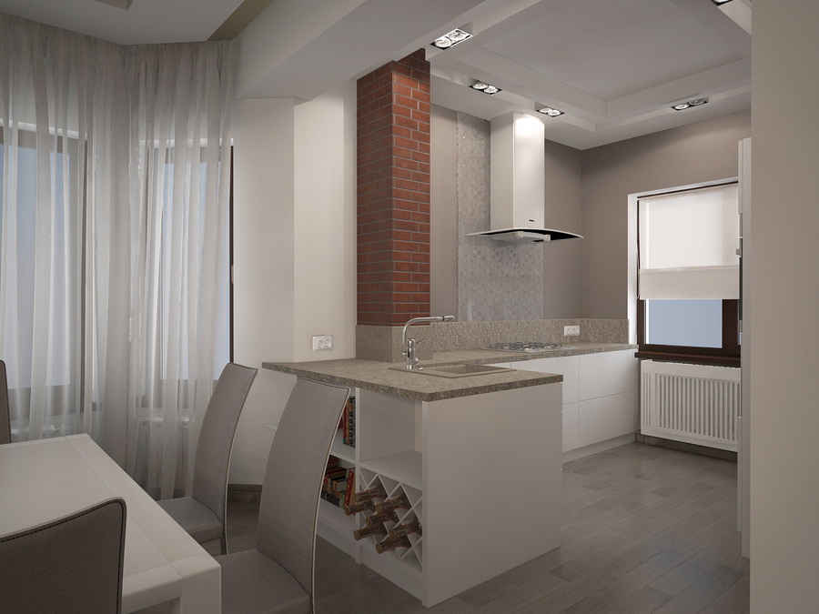 Индивидуальность интерьера создаётся легким индустриальным акцентом; так вытяжки остались из красного кирпича.