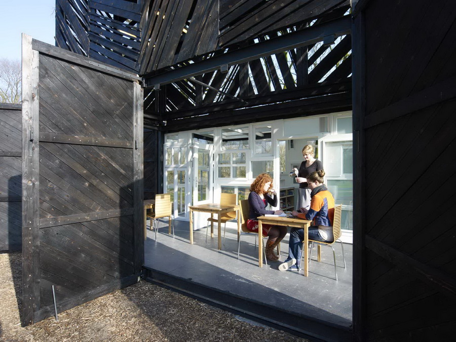 Строение может быть целиком закрыто на ночь с помощью крупных деревянных створок. Для того чтобы внешние деревянные элементы были более износостойкими, они были обожжено по древней японской технологии Шоу Суджи Бан (Shou Sugi Ban).