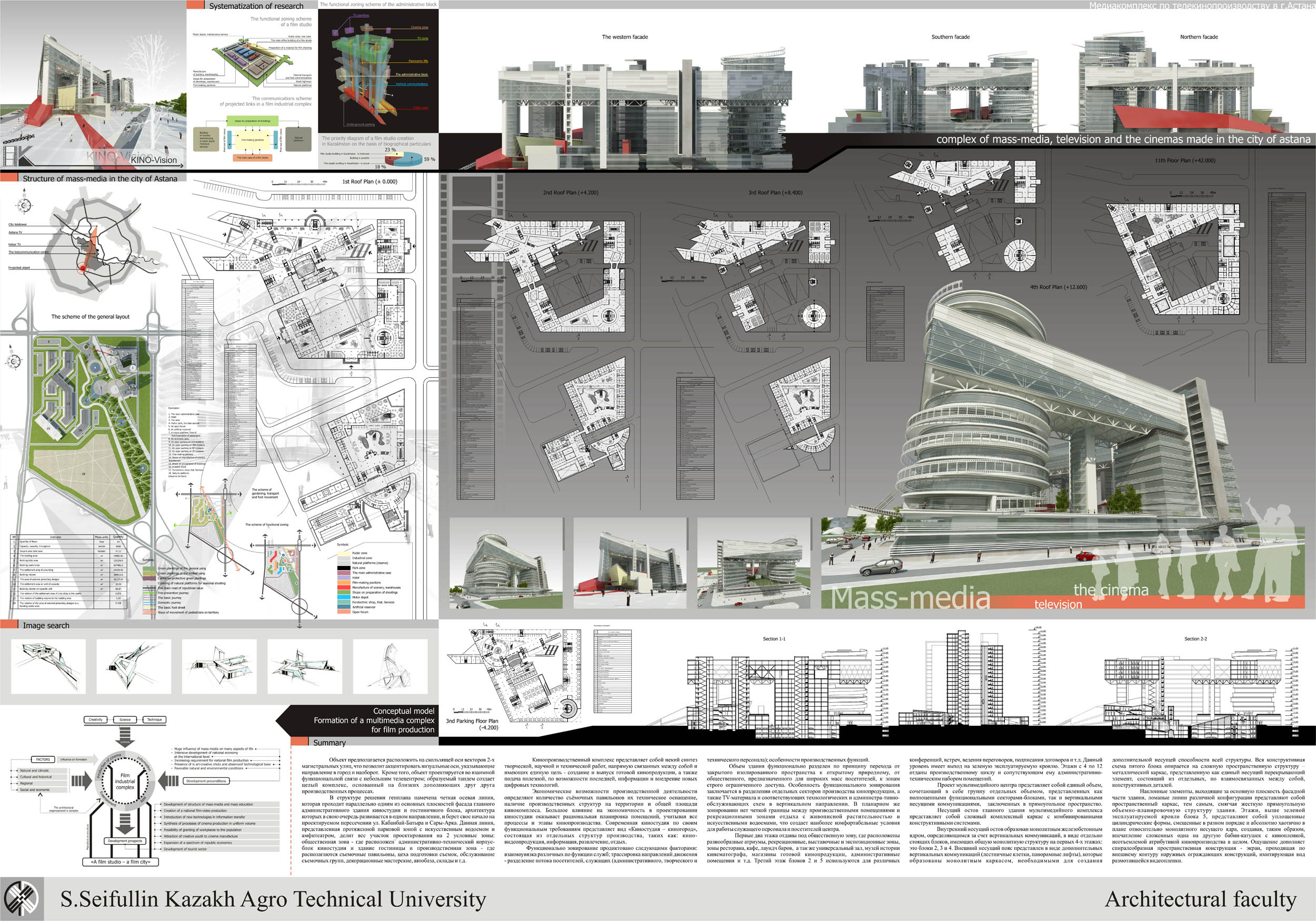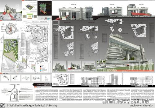 Всё больше работ прибывает на Архиконкурс 2012. Следующим в нашем списке под номером 46 оказался Демьян Параскун. Выпускник Казахского Агротехнического Университета им. С.Сейфуллина прислал на конкурс проект Медиакомплекса по телекинопроизводству. Проект разрабатывался для города Астана, Казахстан. Давайте не будем оставлять участника без поддержки в социальных сетях!