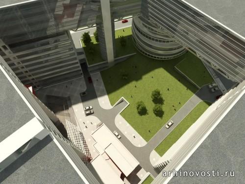 Объект предполагается расположить на скользящей оси векторов 2-х магистральных улиц, что позволит акцентировать визуальные оси, указывающие направление в город и наоборот. Кроме того, объект проектируется во взаимной функциональной связи с небольшим телецентром; образуемый тандем создает целый комплекс, основанный на близких дополняющих друг друга производственных процессах.
