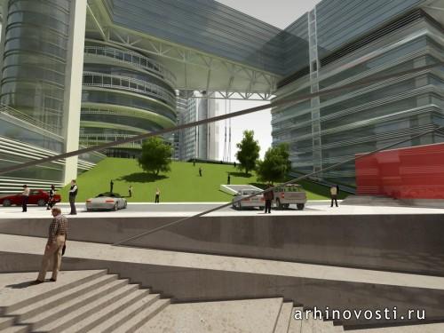 Внутренний несущий остов образован монолитным железобетонным ядром, определяющимся за счет вертикальных коммуникаций, в виде отдельно стоящих блоков, имеющих общую монолитную структуру на первых 4-х этажах: это блоки 2, 3 и 4. Внешний несущий пояс представлен в виде дополнительных вертикальных коммуникаций (лестничные клетки, панорамные лифты), которые образованы монолитным каркасом, необходимыми для создания дополнительной несущей способности всей структуры. Вся конструктивная схема пятого блока опирается на сложную пространственную структуру – металлический каркас, представленную как единый несущий перекрывающий элемент, состоящий из отдельных, но взаимосвязанных между собой, конструктивных деталей.