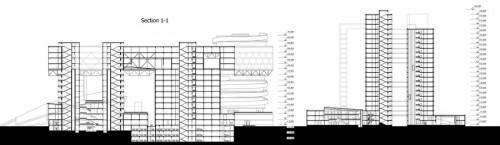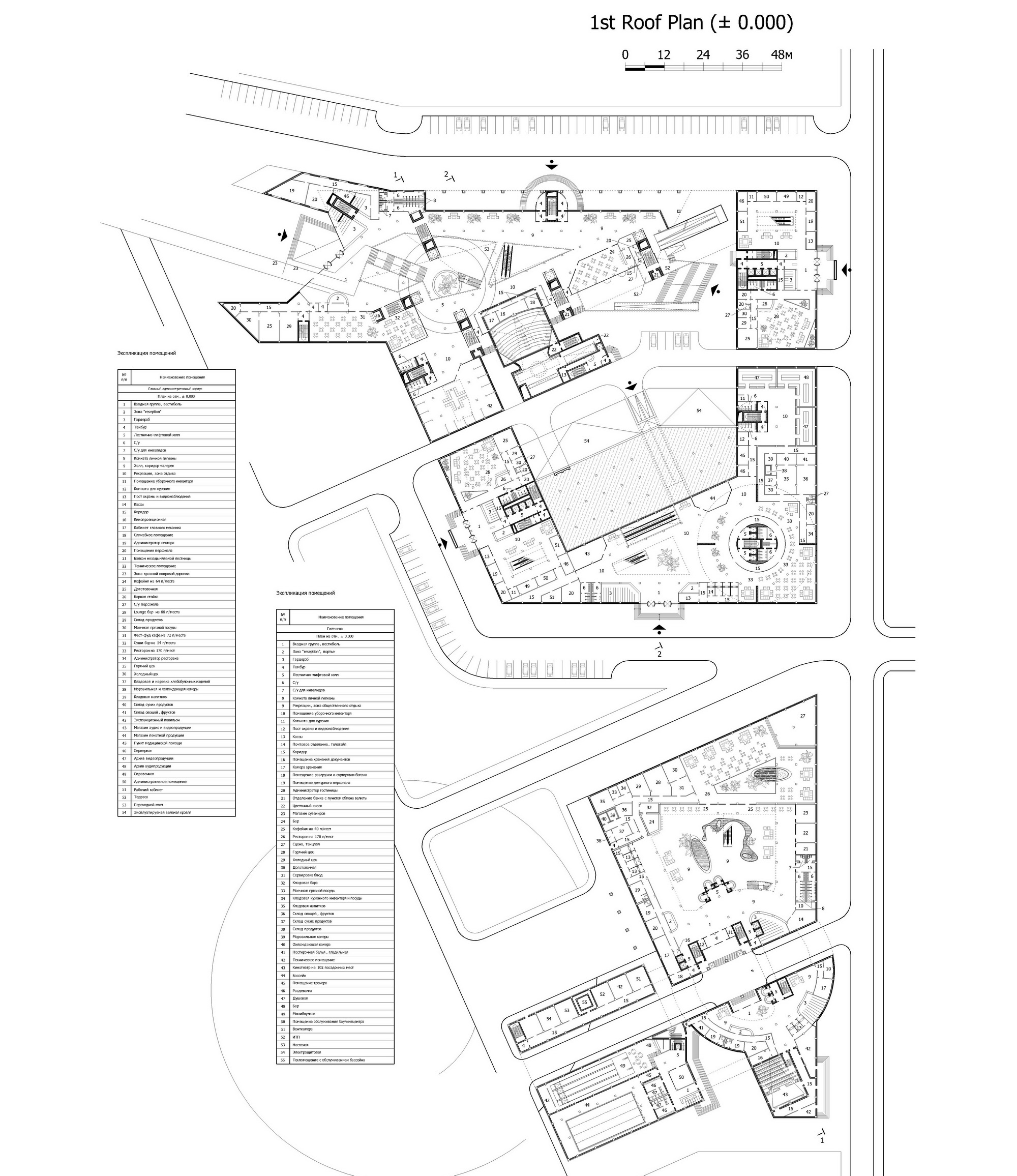 Первые два этажа отданы под общественную зону, где расположены разнообразные атриумы, рекреационные, выставочные и экспозиционные зоны, зоны ресторана, кафе, лаундч баров, а так же универсальный зал, музей истории кинематографа, магазины готовой кинопродукции, административные помещения и т.д. Третий этаж блоков 2 и 5 используются для различных конференций, встреч, ведения переговоров, подписания договоров и т.д. Данный уровень имеет выход на зеленую эксплуатируемую кровлю. Этажи с 4 по 12 отданы производственному циклу и сопутствующим ему административно-техническим набором помещений.