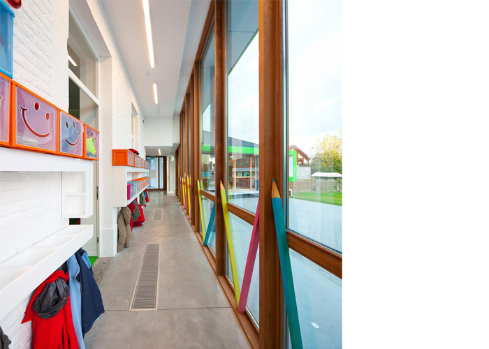 Коридор, который связывает классы и другие зоны в школе, был вынесен наружу здания. Эта застеклённая галерея является также «двойной кожей» здания. Она помогает поддерживать климатический баланс в учебном заведении.