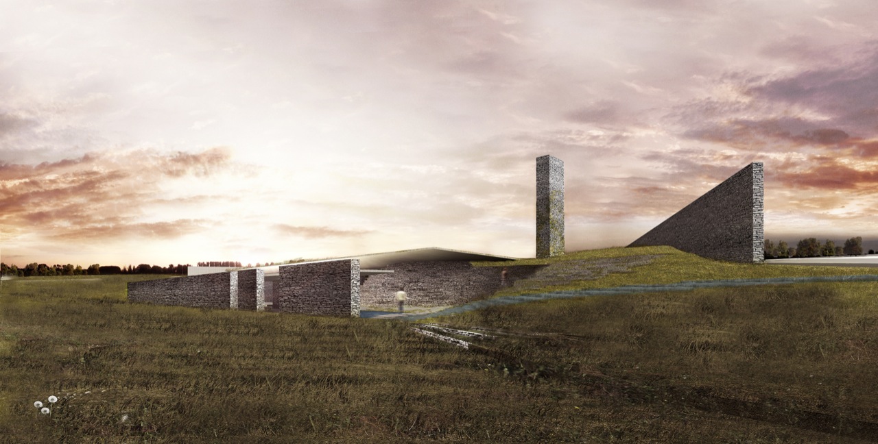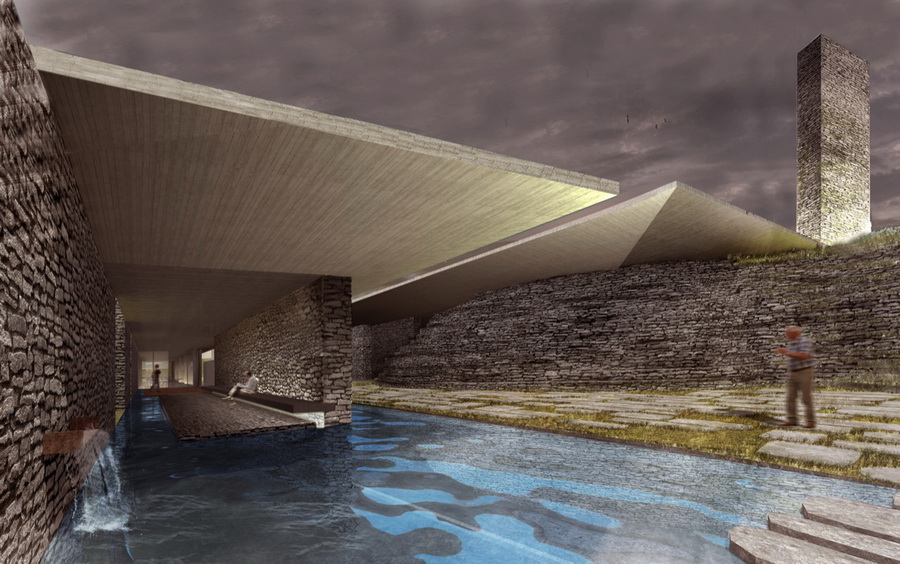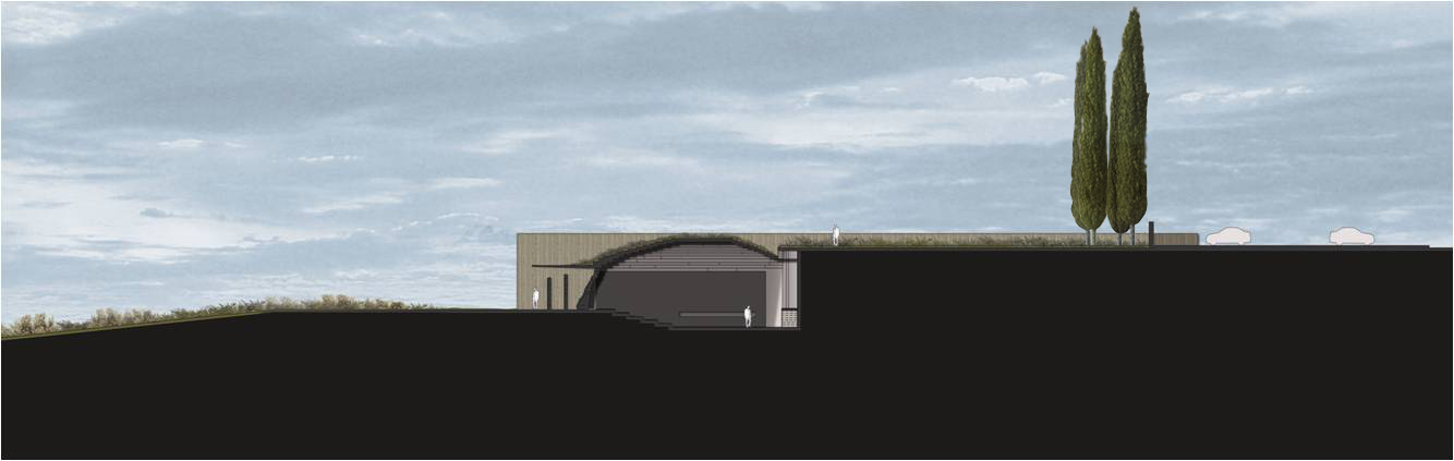 Погруженное в холм здание смешивается с окружающим ландшафтом, формируя отдельное уединённое пространство.