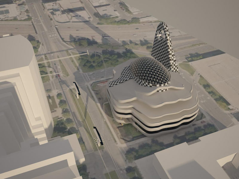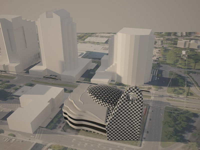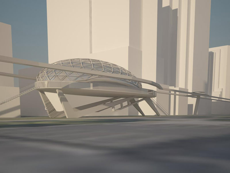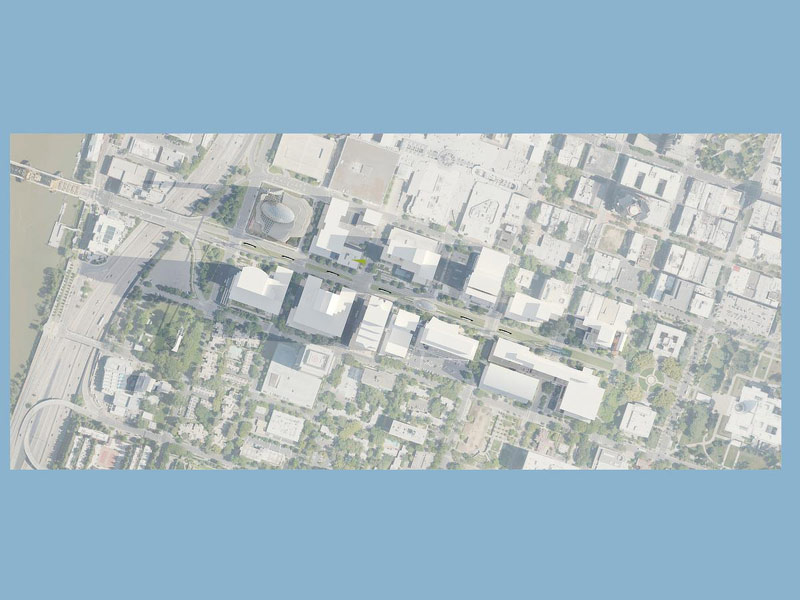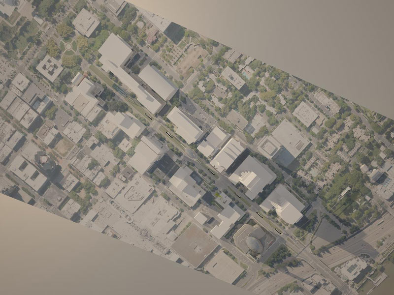 Главная идея концепции монорельсовая железная дорога для туристов. Монорельс соединяет важные станции ” California State Capitol “, лаундж-кафе, торговый центр и ” Crocker Art museum “.