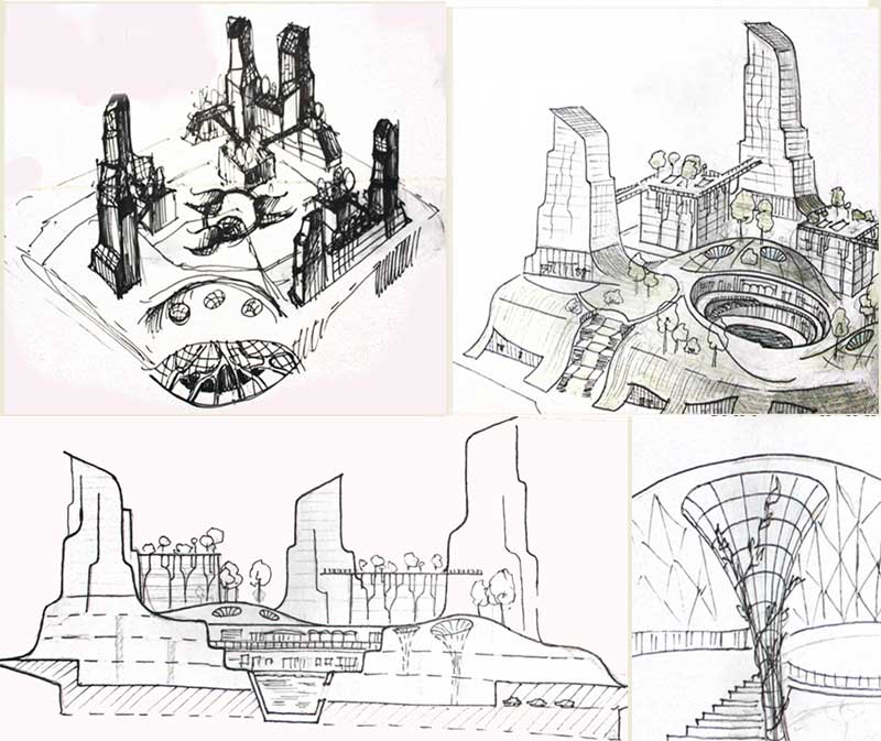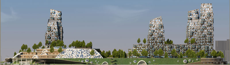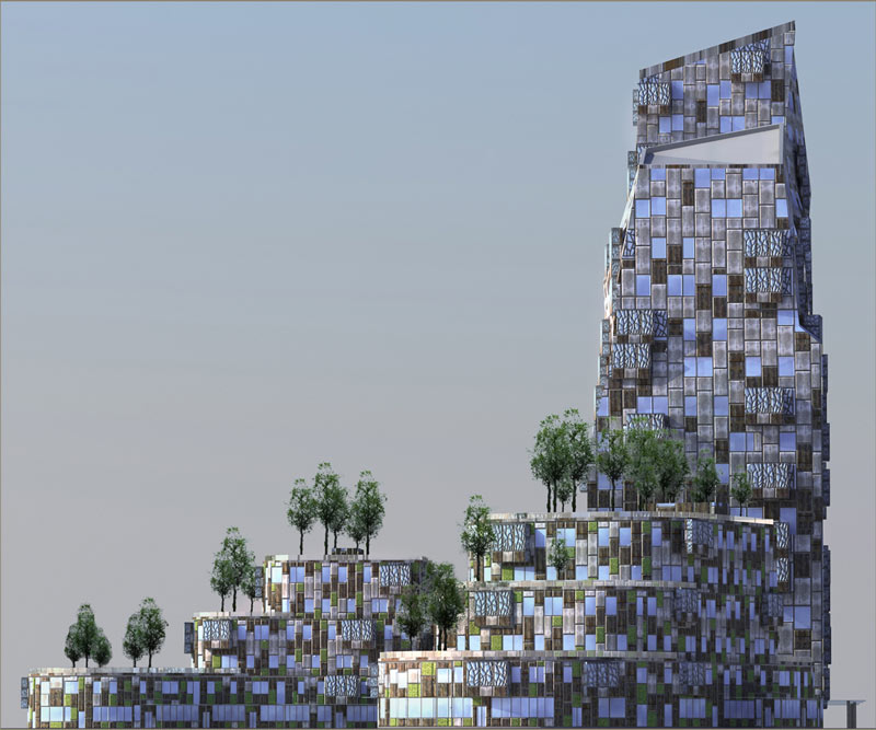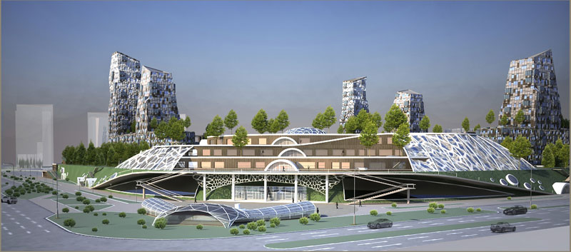 Основной объем многофункционального центра имеет 5 этажей, выполняющих торгово-развлекательную функцию; 3 верхних этажа представляют собой террасы с местами для отдыха и прогулок. Боковые пристройки (гипермаркет и крытая стоянка) и 2х-этажные стоянки для жильцов являются платформами, над которыми размещаются жилые дома с дворовыми территориями.