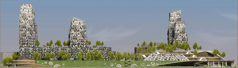 Дворы жилых групп и общественный центр связаны посредством ландшафтного парка с водоемом, что делает среду привлекательнее, а проживание комфортным.