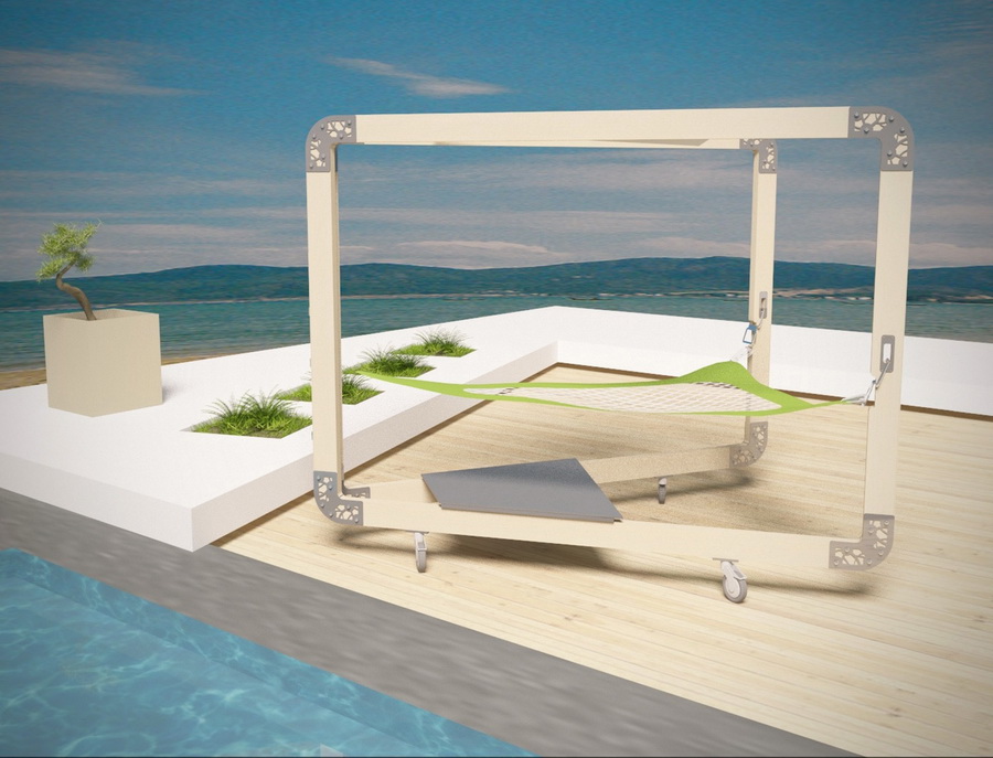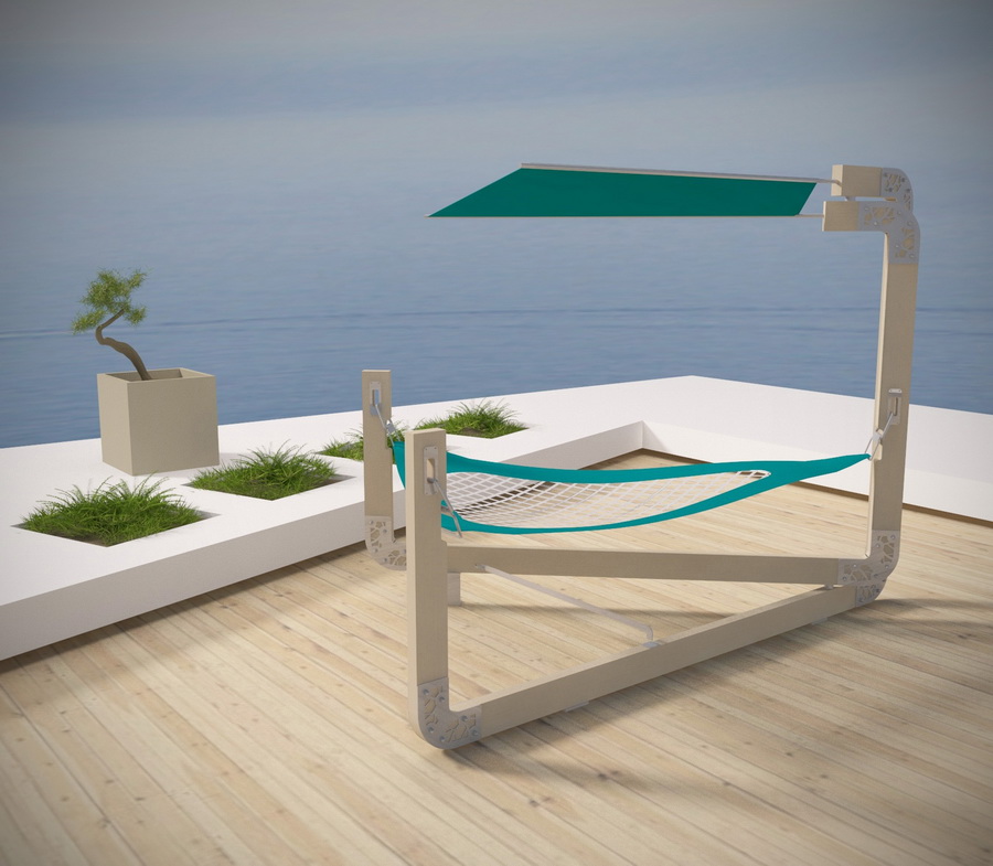 При раскрытии (в рабочем состоянии) конструкция фиксируется роликовыми колесами со стопором по всем осям, позволяя ей быть статичной, а также стальной балкой, которая распирает конструкцию. Но я также предлагаю варианты использования изделия без колесной опоры в тех случаях, когда мы предполагаем использовать гамак не на твердой прямой поверхности, а на песке, к примеру. При сложении конструкции, сам гамак легко снимается с петель, что делает его легким в эксплуатации – если мы захотим постирать изделие или поменять его на гамак другого цвета или материала. Я также постаралась учесть тот факт, что гамак будет использоваться на природе, под солнцем, поэтому оснастила его тентом с UF-фильтром, что немаловажно для данного изделия.