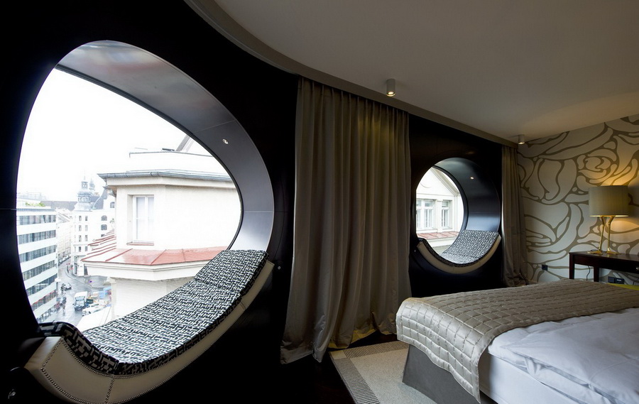 Внутри в номерах окна были приспособлены под место, где можно посидеть или полежать, рассматривая при этом бурлящую снаружи городскую жизнь.