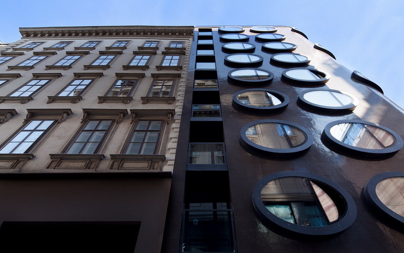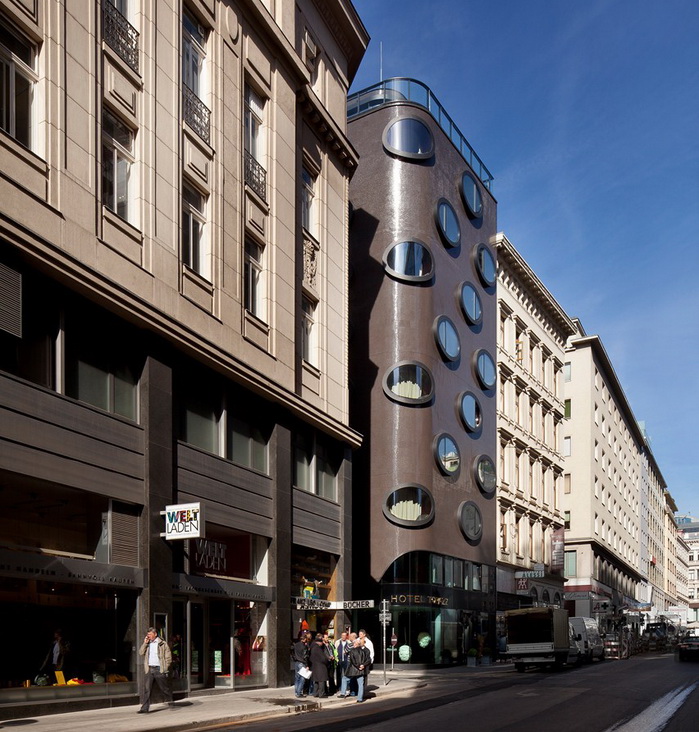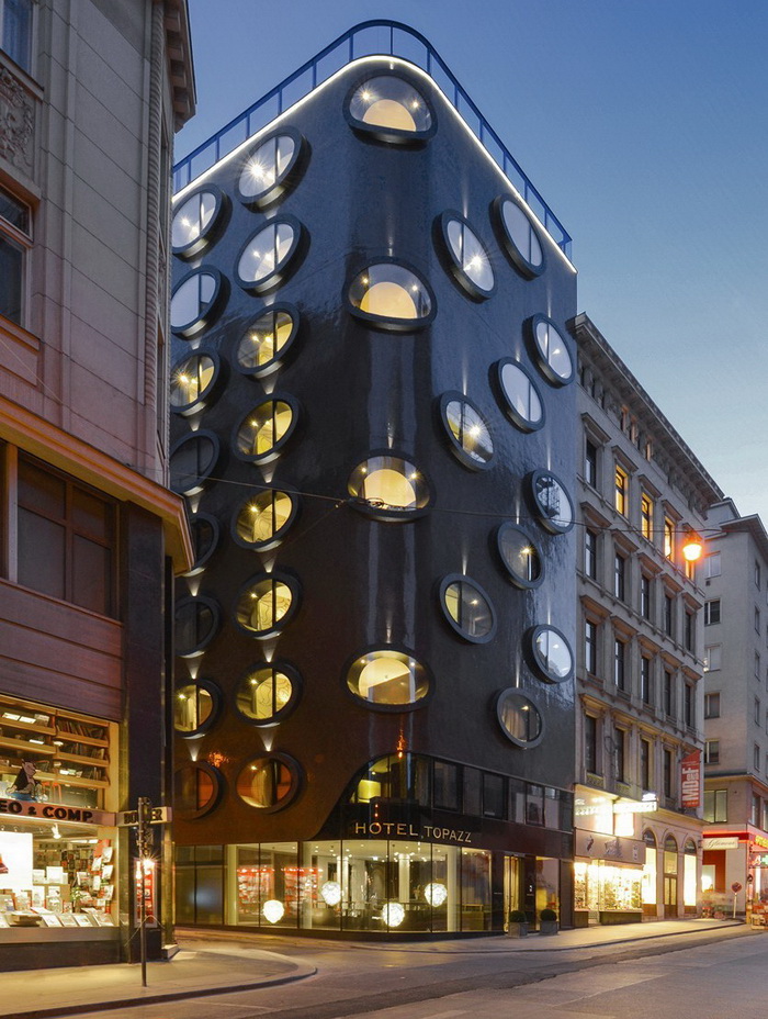 Это тёмное здание пришло в центр города Вена, Австрия, из параллельной вселенной в 2012 году. И вполне хорошо прижилось в окружении более традиционных сооружений. В нём разместился отель Topazz. Над созданием «многоглазого пришельца» трудились специалисты из архитектурной компании BWM Architects und Partner.