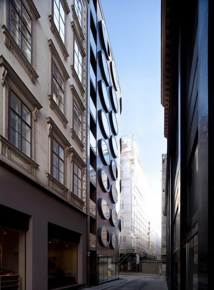 Объект, выросший на одной из самых маленьких строительных площадок города (всего 153 квадратных метра), можно сравнить с тёмным драгоценным камнем. Его коричневый фасад частично поглощает, а частично отражает солнечный свет.